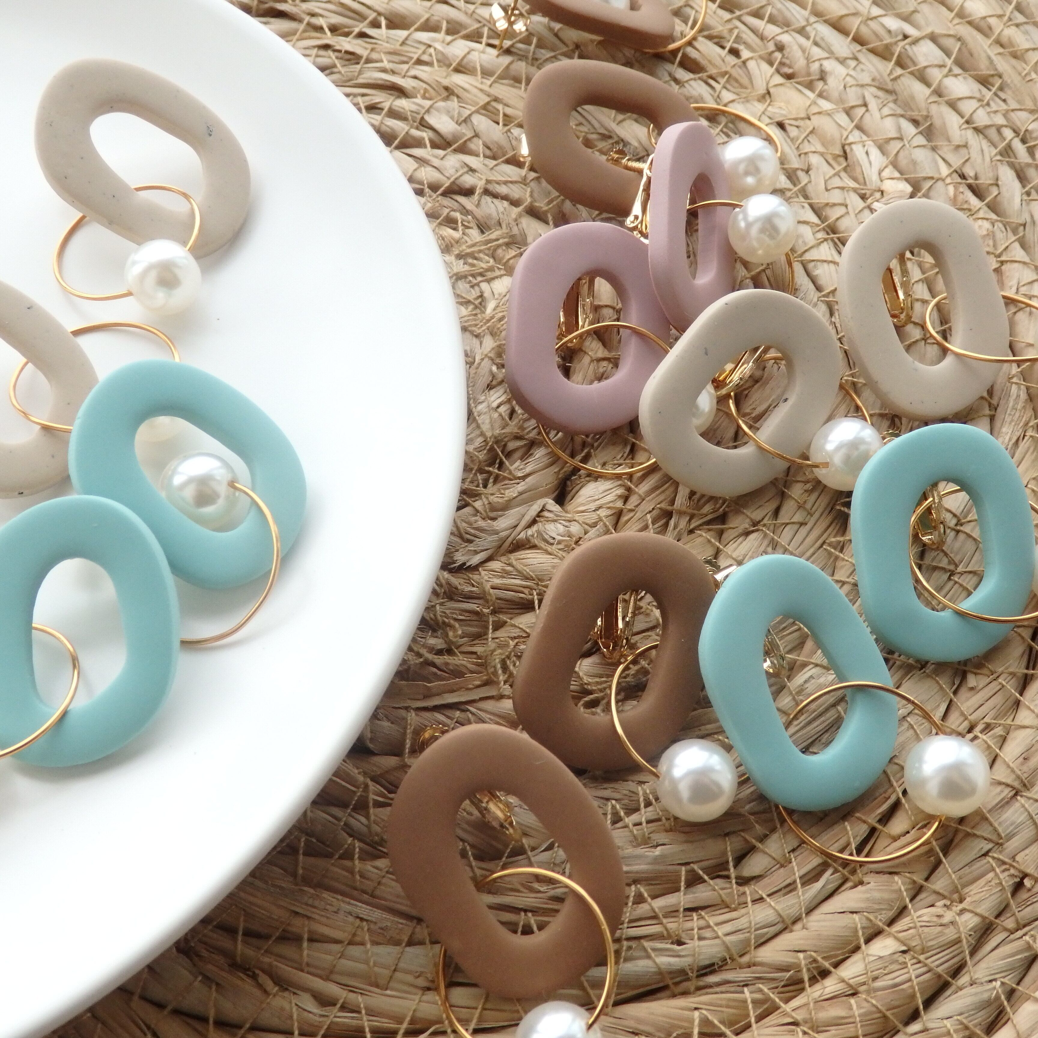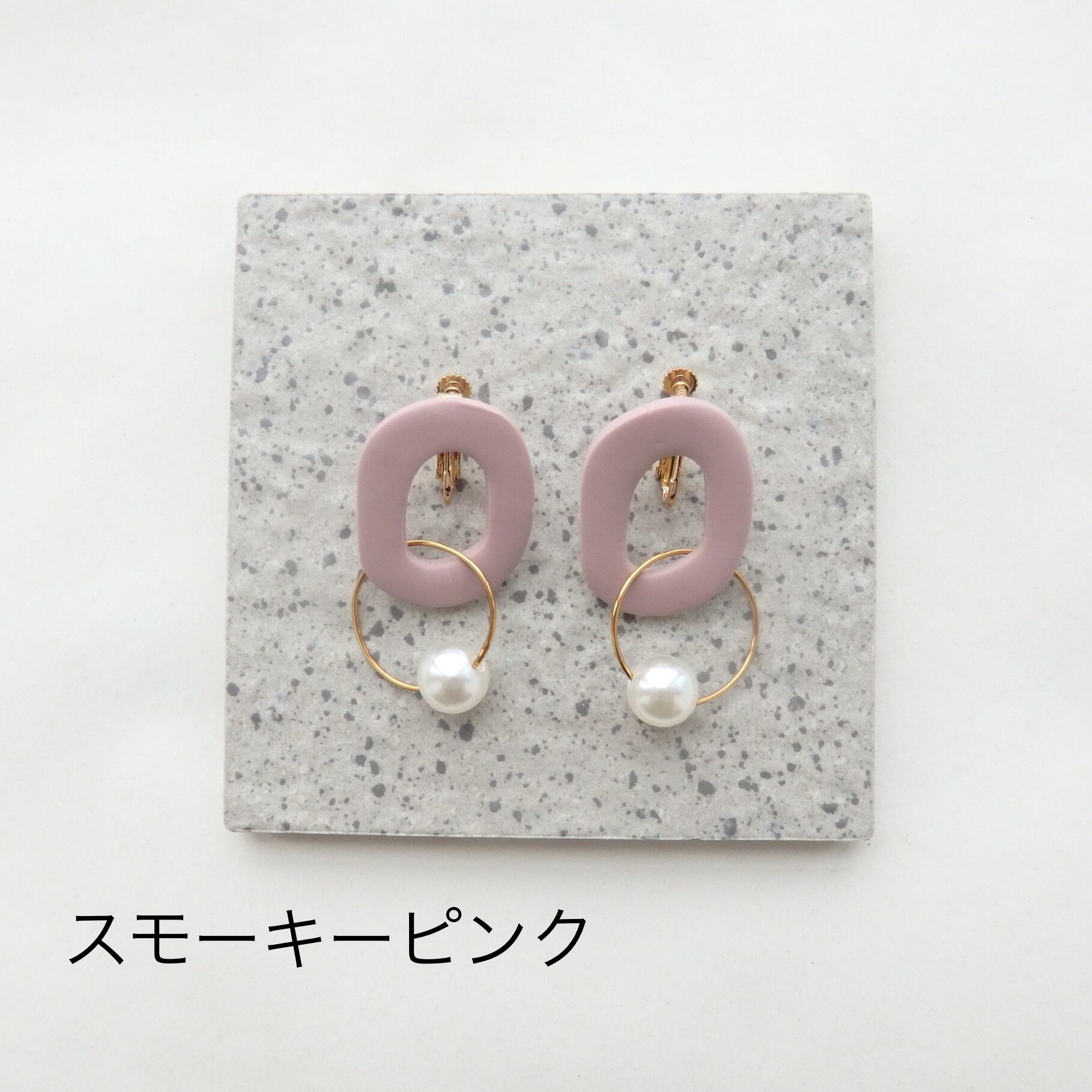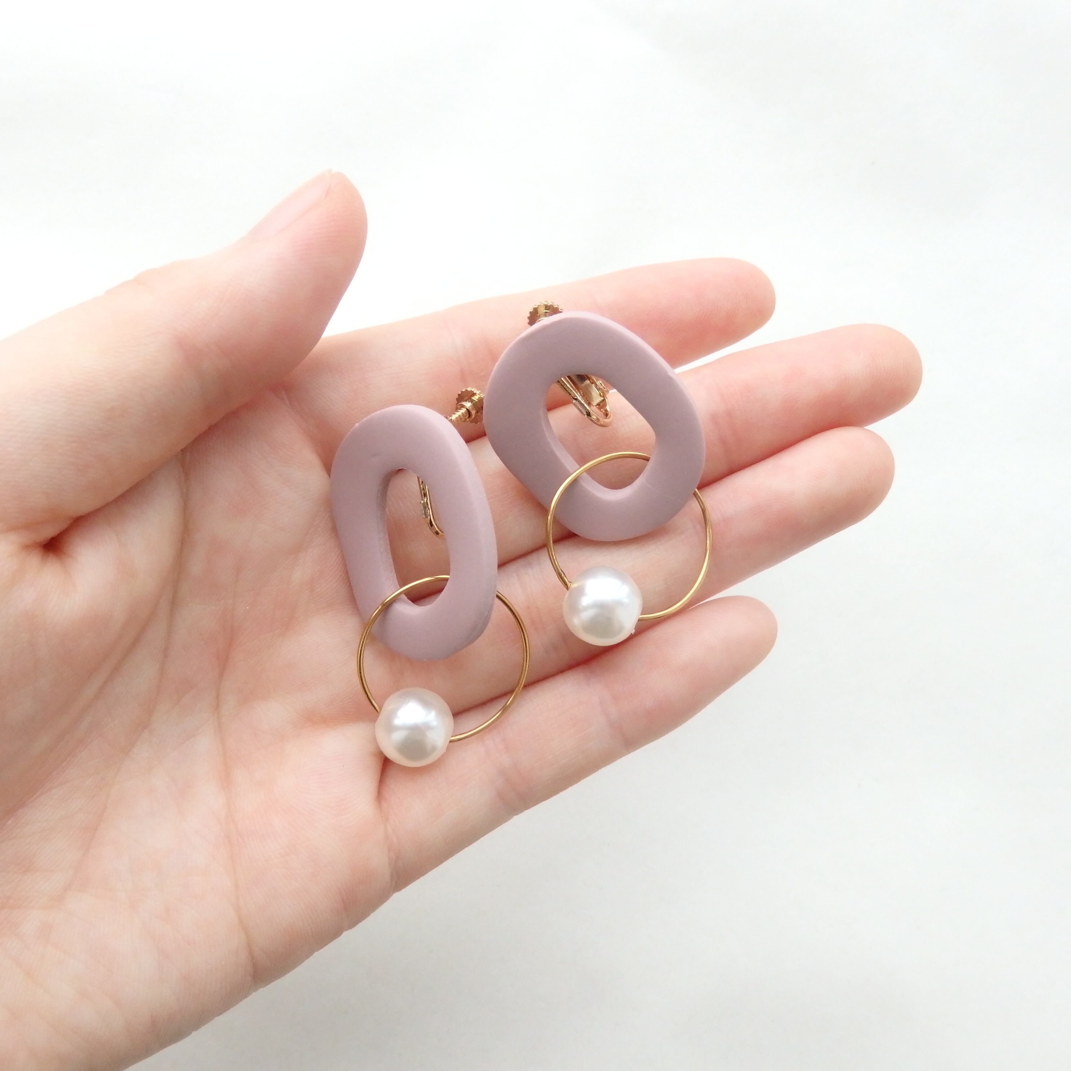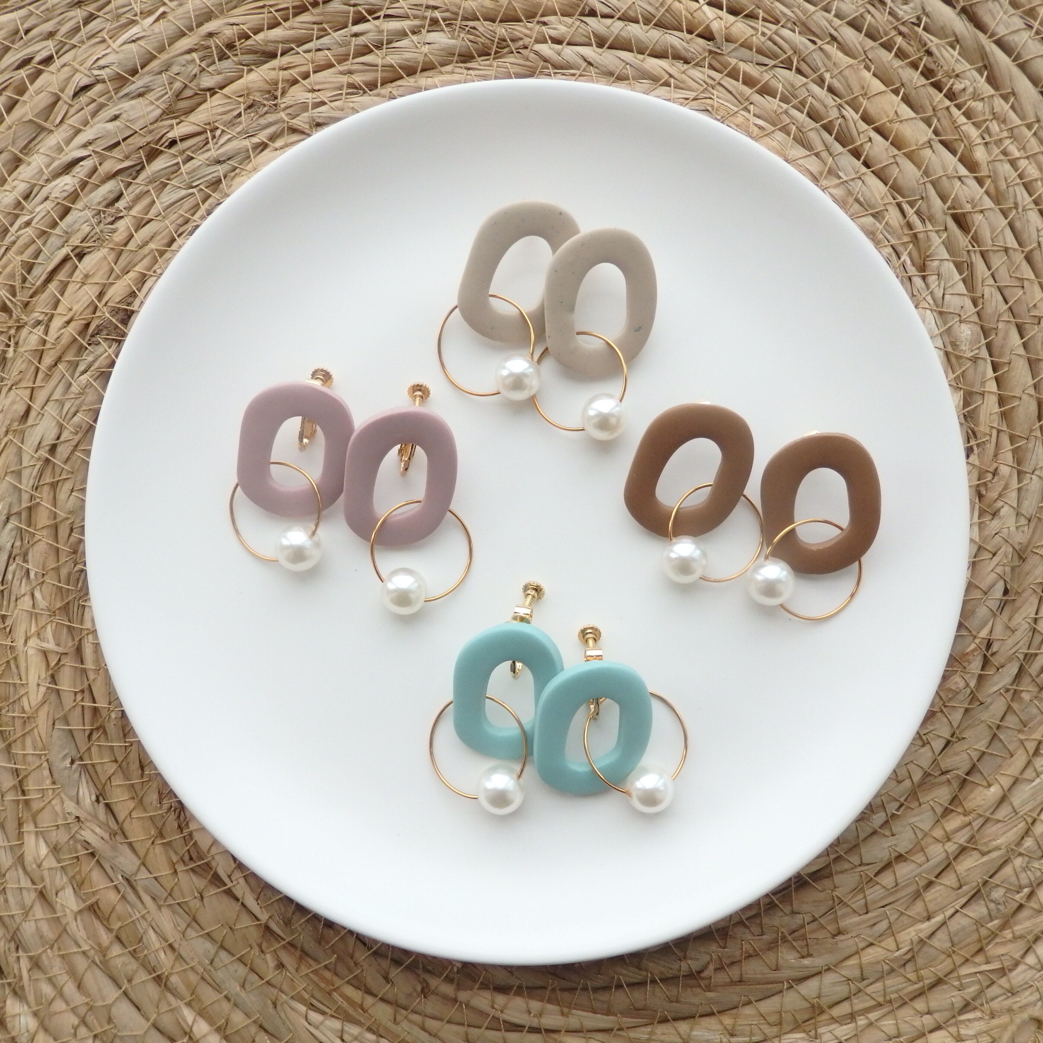優しい色味のポリマークレイにパールが揺れるカジュアルながらも女性らしいデザイン。