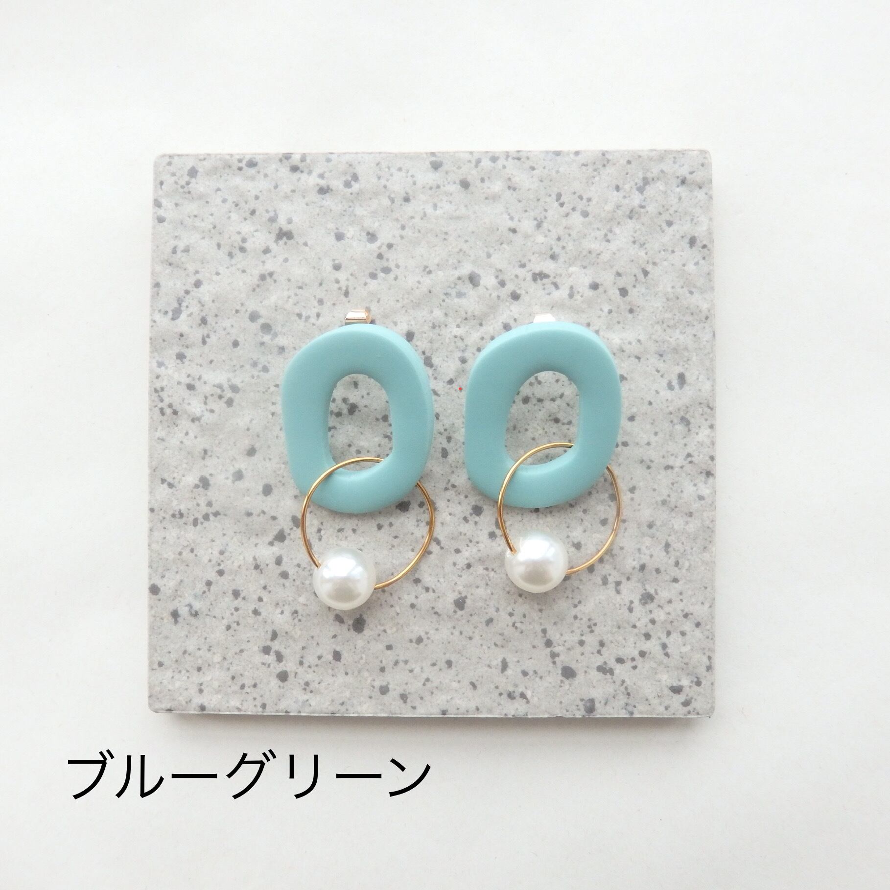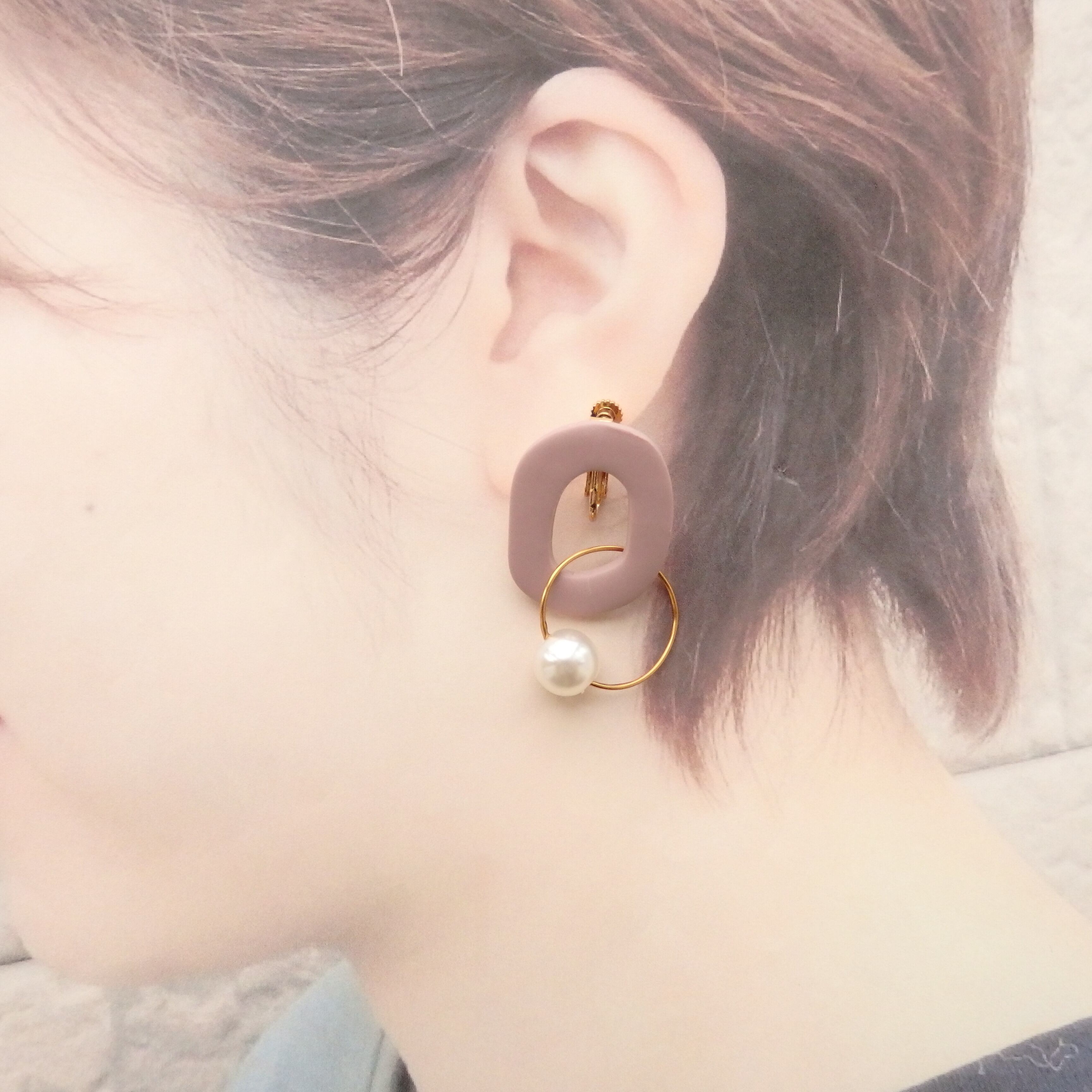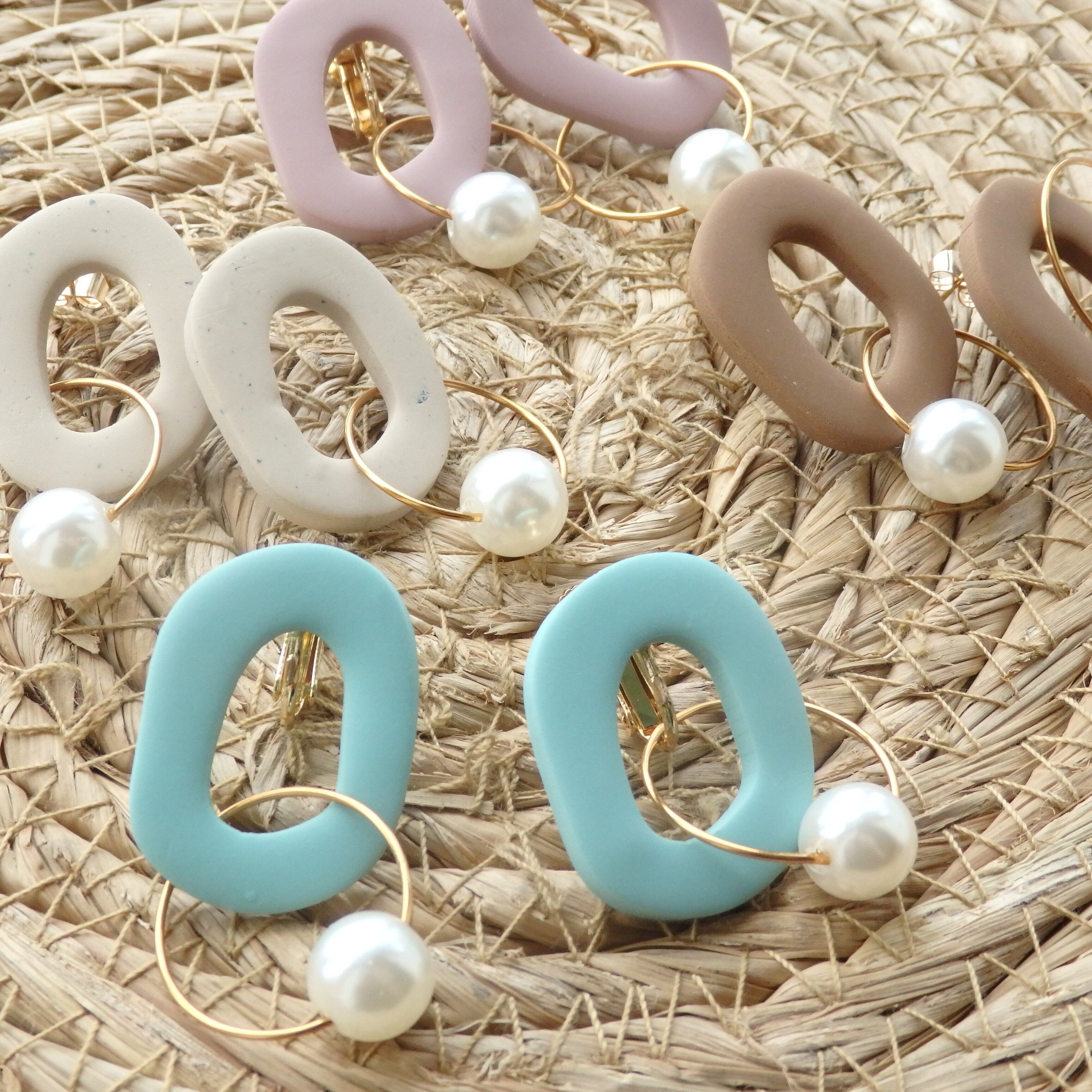 優しい色味のポリマークレイにパールが揺れるカジュアルながらも女性らしいデザイン。