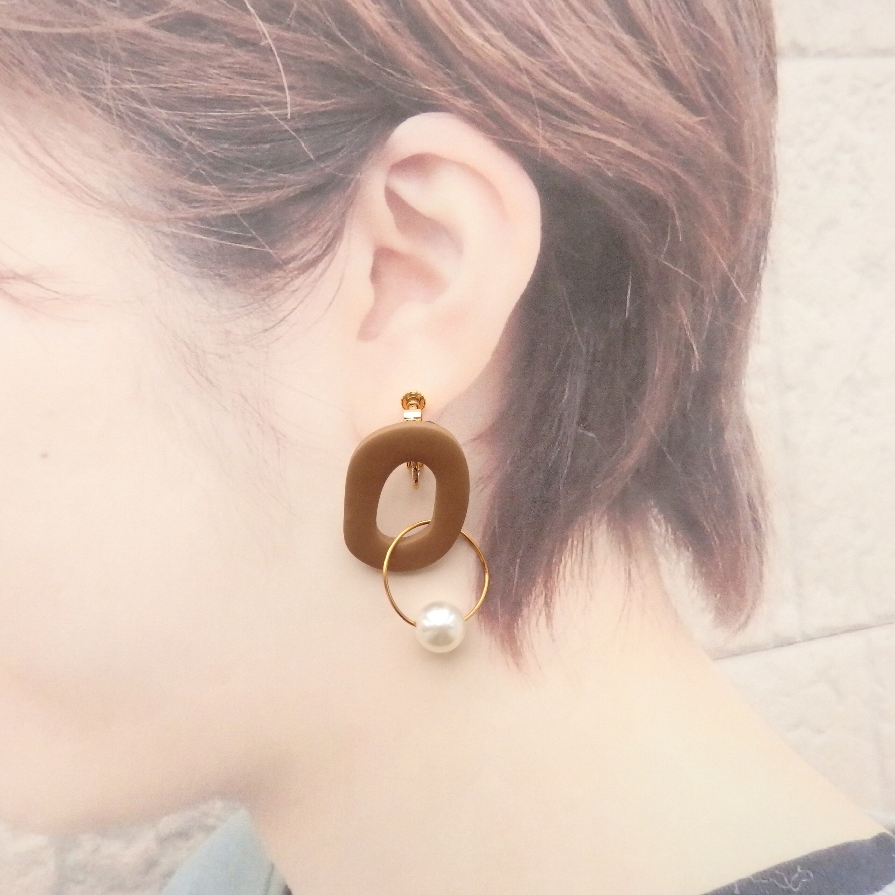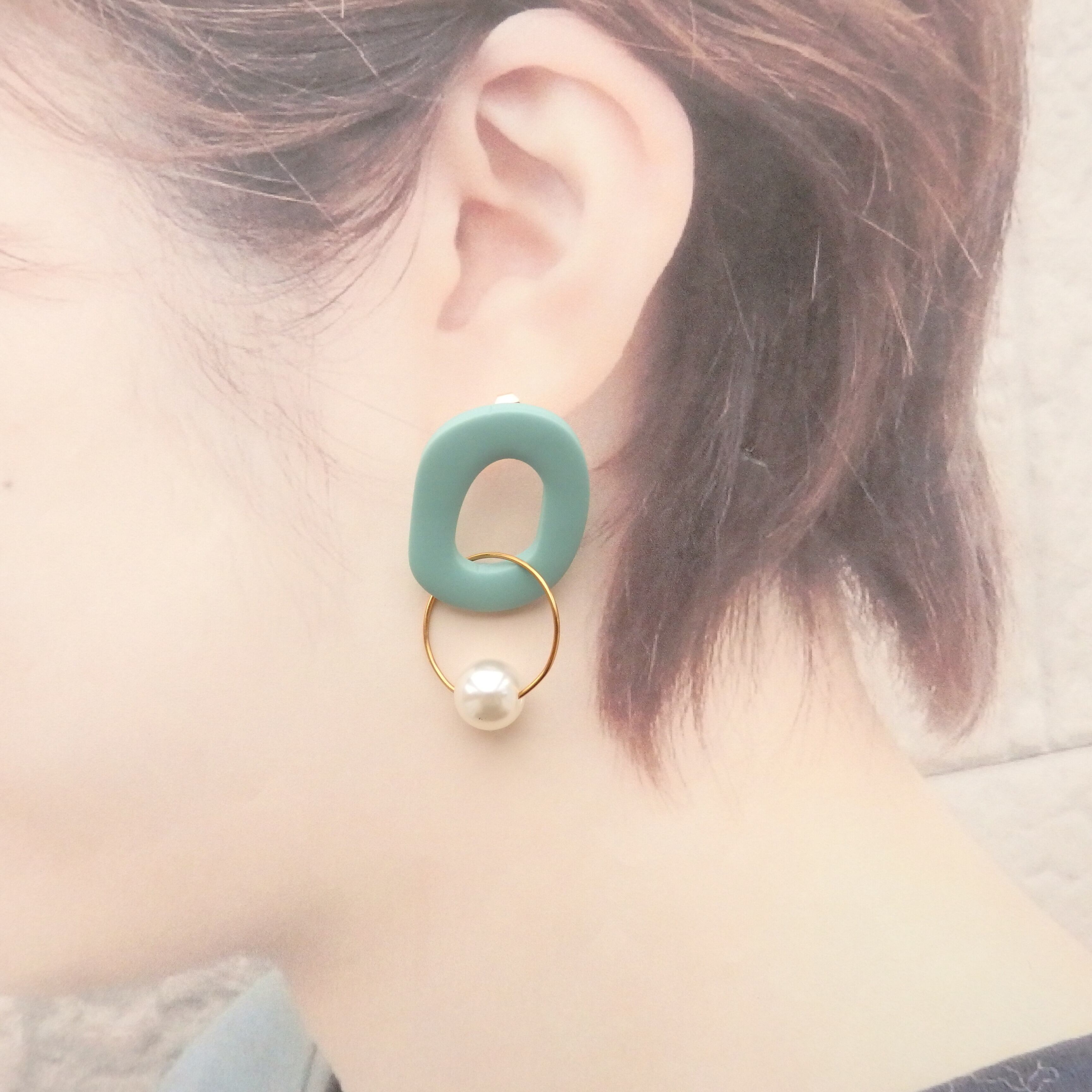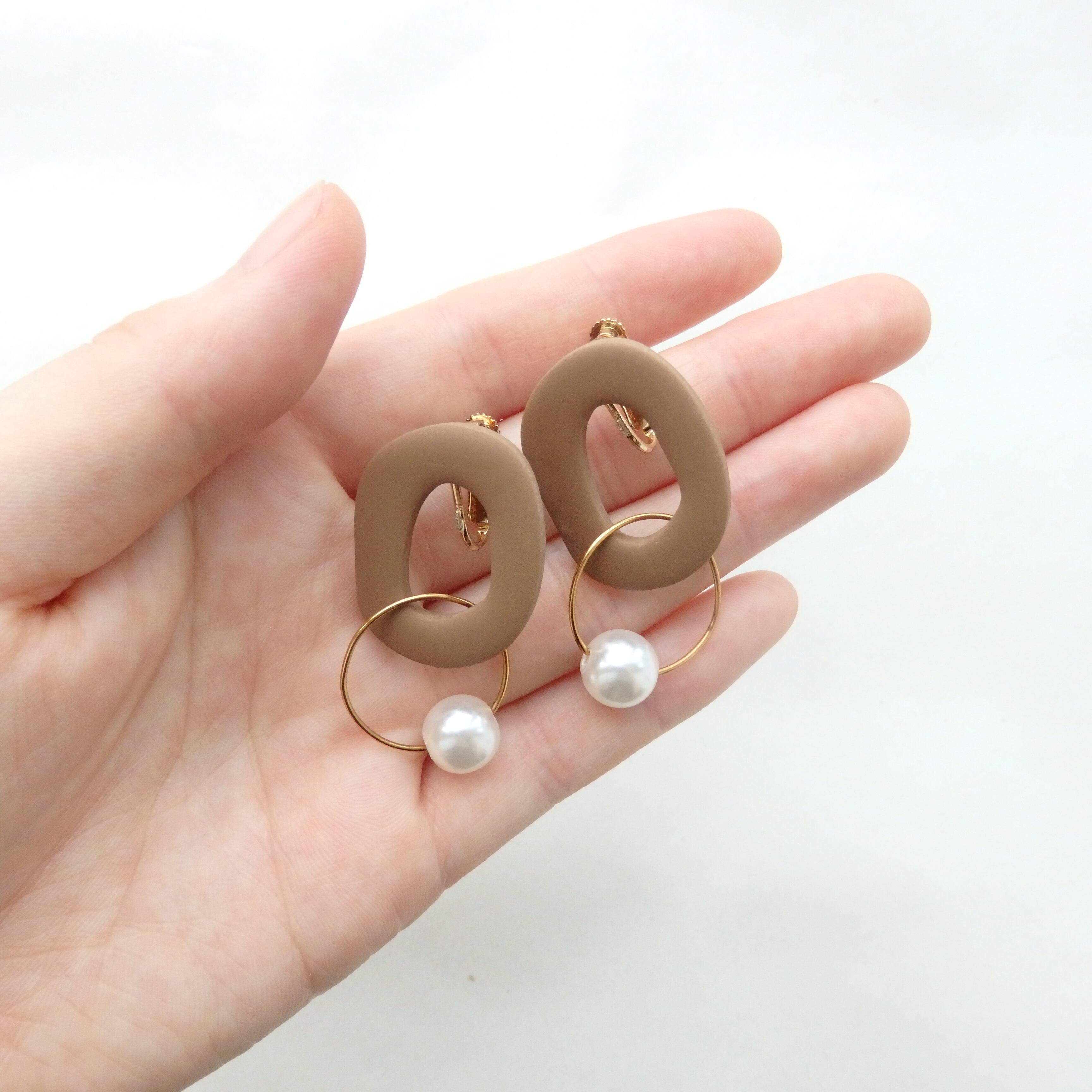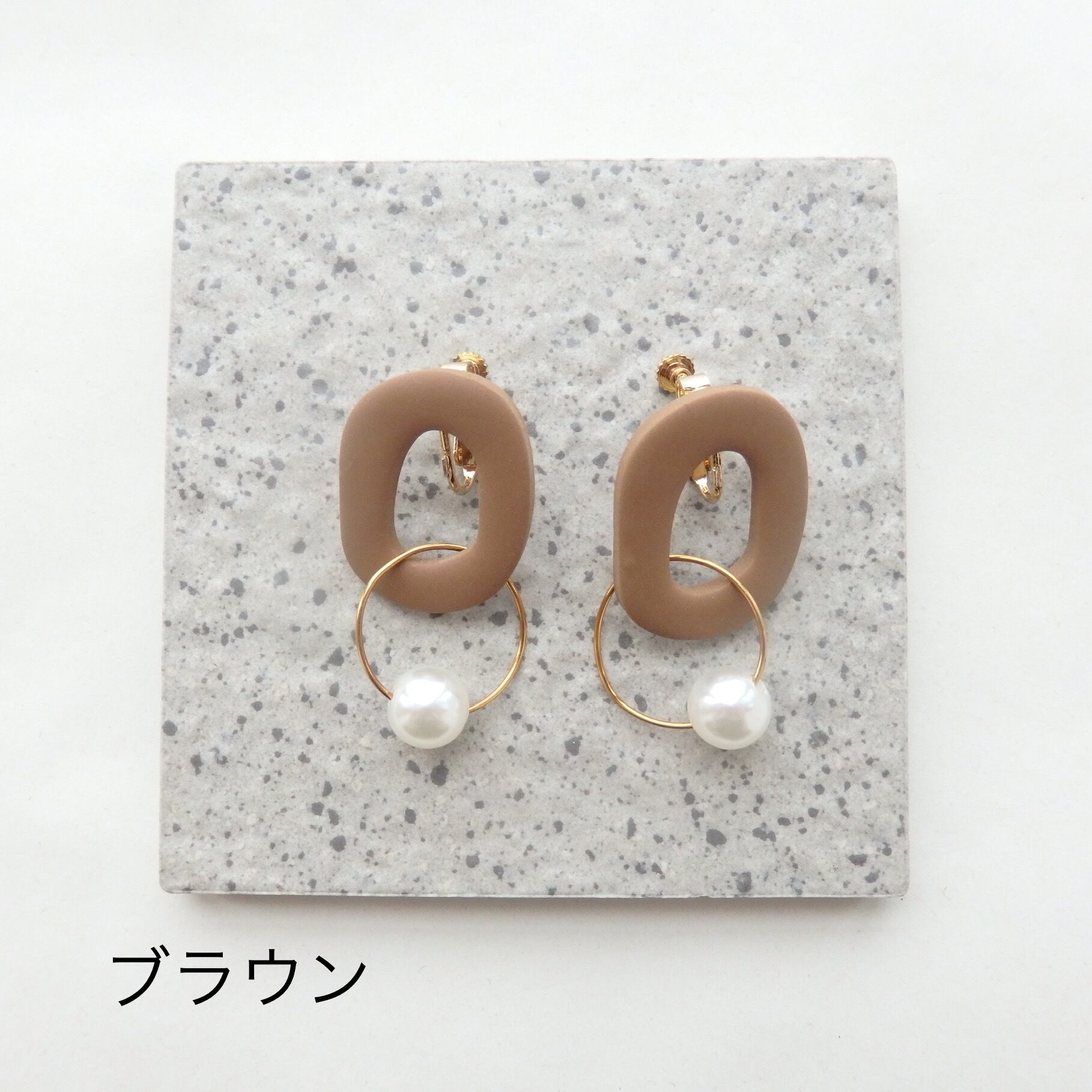 優しい色味のポリマークレイにパールが揺れるカジュアルながらも女性らしいデザイン。