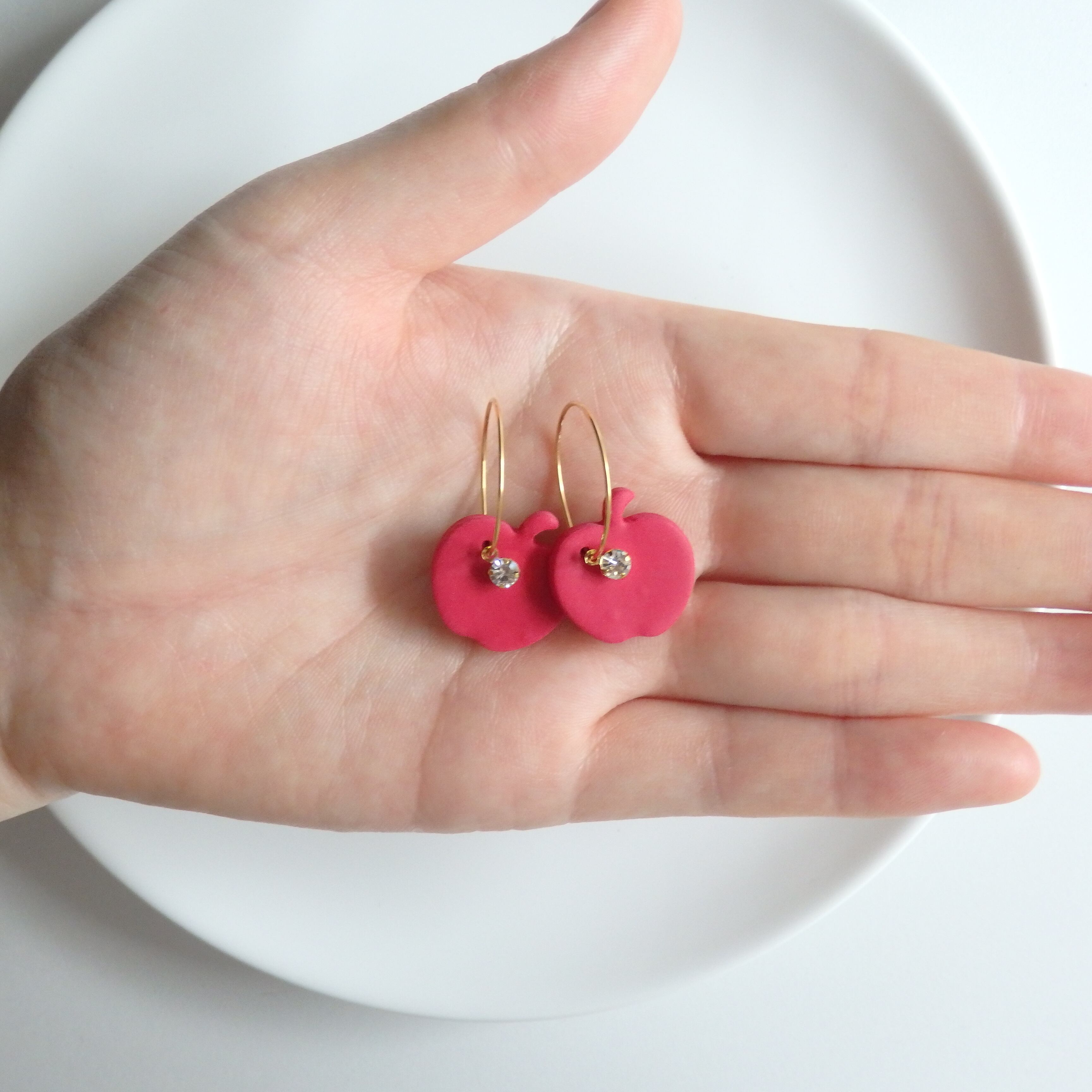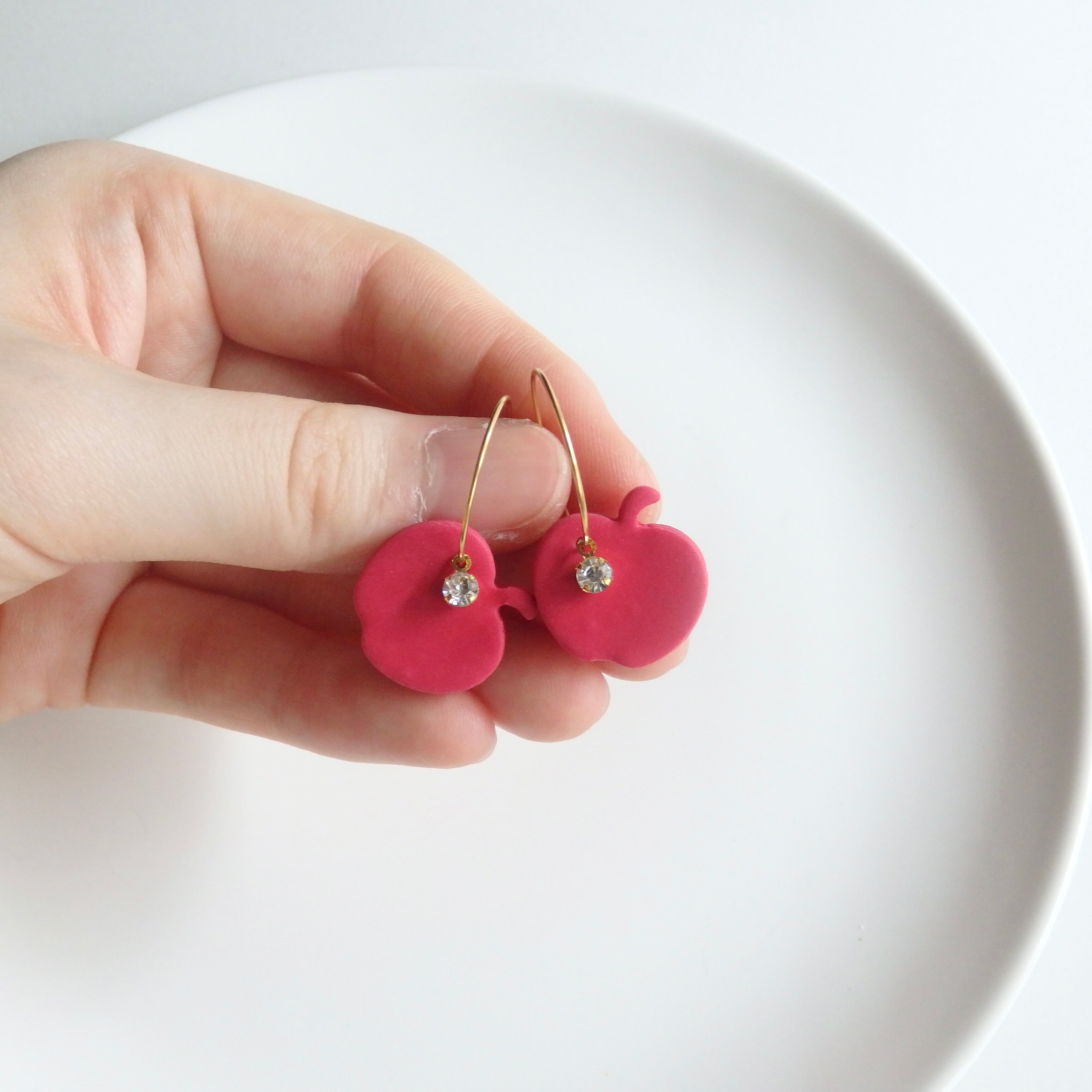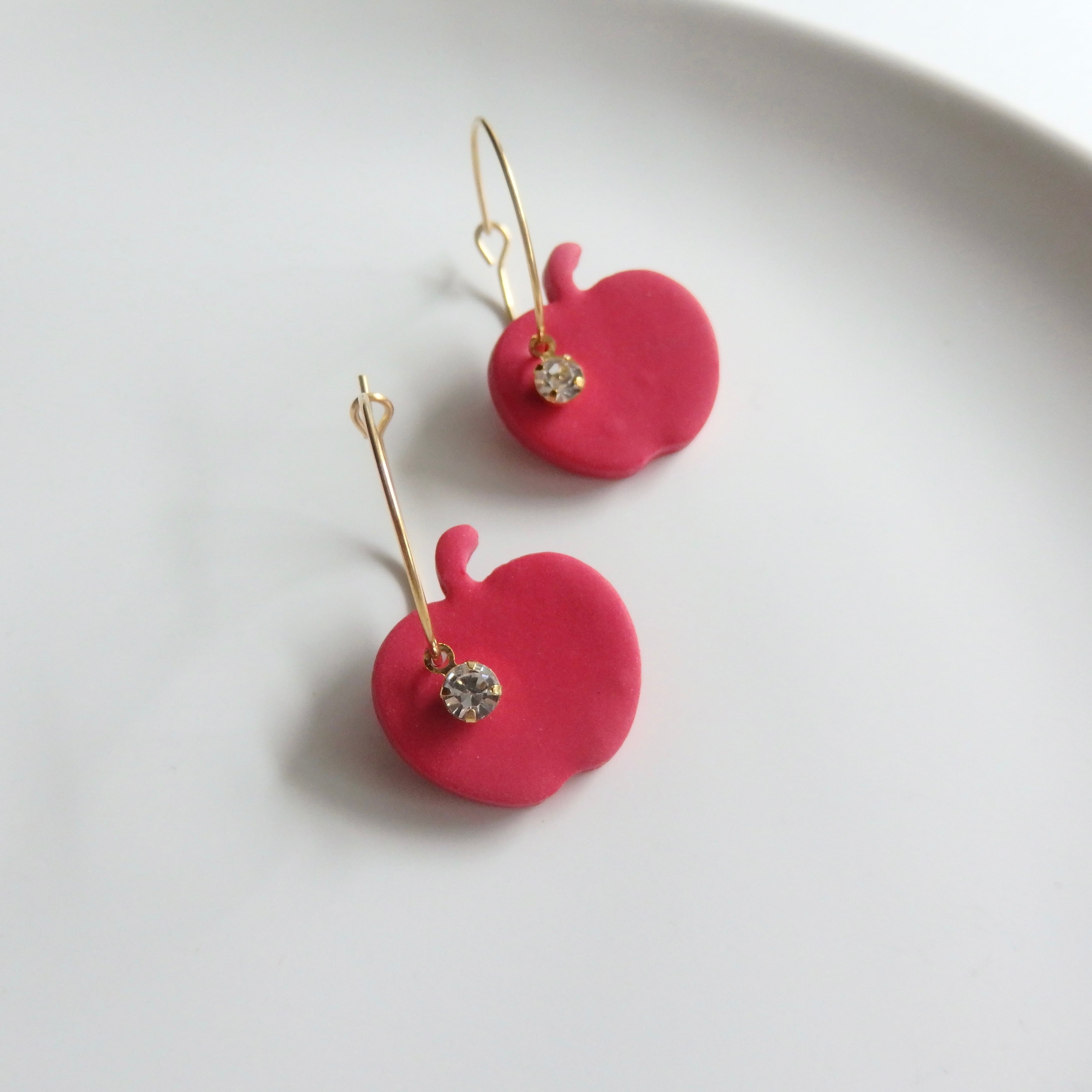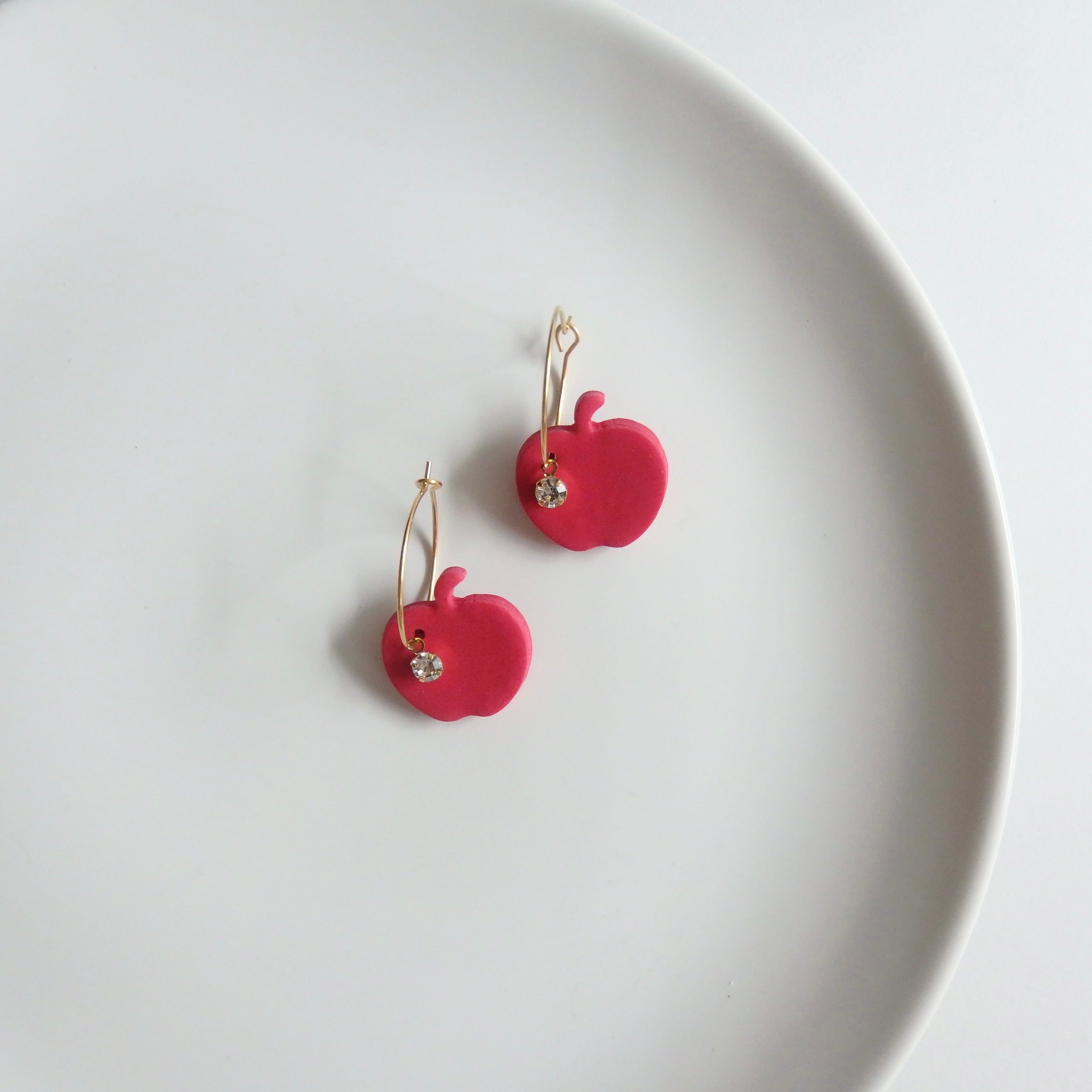 鮮やかな赤いりんごとキラキラ輝くストーンが魅惑のピアス。